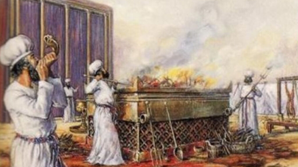 Observamos aqui a composição do espaço do santuário, tendo o altar dos holocaustos na parte inferior do tabernáculo, porem dentro do átrio, a bacia com